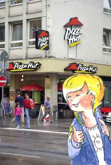 Anna und ich gehen oft in die Pizzeria. Wenn unsere Eltern nicht zu Hause sind, können wir den Pizzaservice anrufen. Die bringen dann die Pizza ins Haus. Und Anna hat auch ein Rezept für Pizza. Sie belegt den Teig mit Tomaten, Salami und Kräutern. Dann noch eine leckere Soße drauf und fertig ist die Pizza!